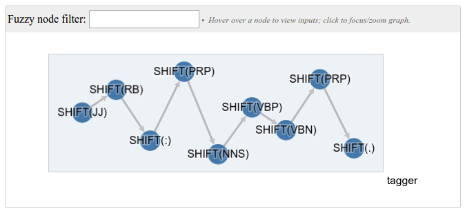 SyntaxNet running example (TBD): A shift-only SyntaxNet Component doesn’t predict any annotations, but just consumes one token or character at a time. This is useful when the Component is running a LSTM: the LSTM can consume characters to form word representations, or consume words right-to-left to compute representations for the upcoming words when parsing. ParseySaurus uses such a LSTM-based Component to preprocess the data in right-to-left order and obtain richer input representations.