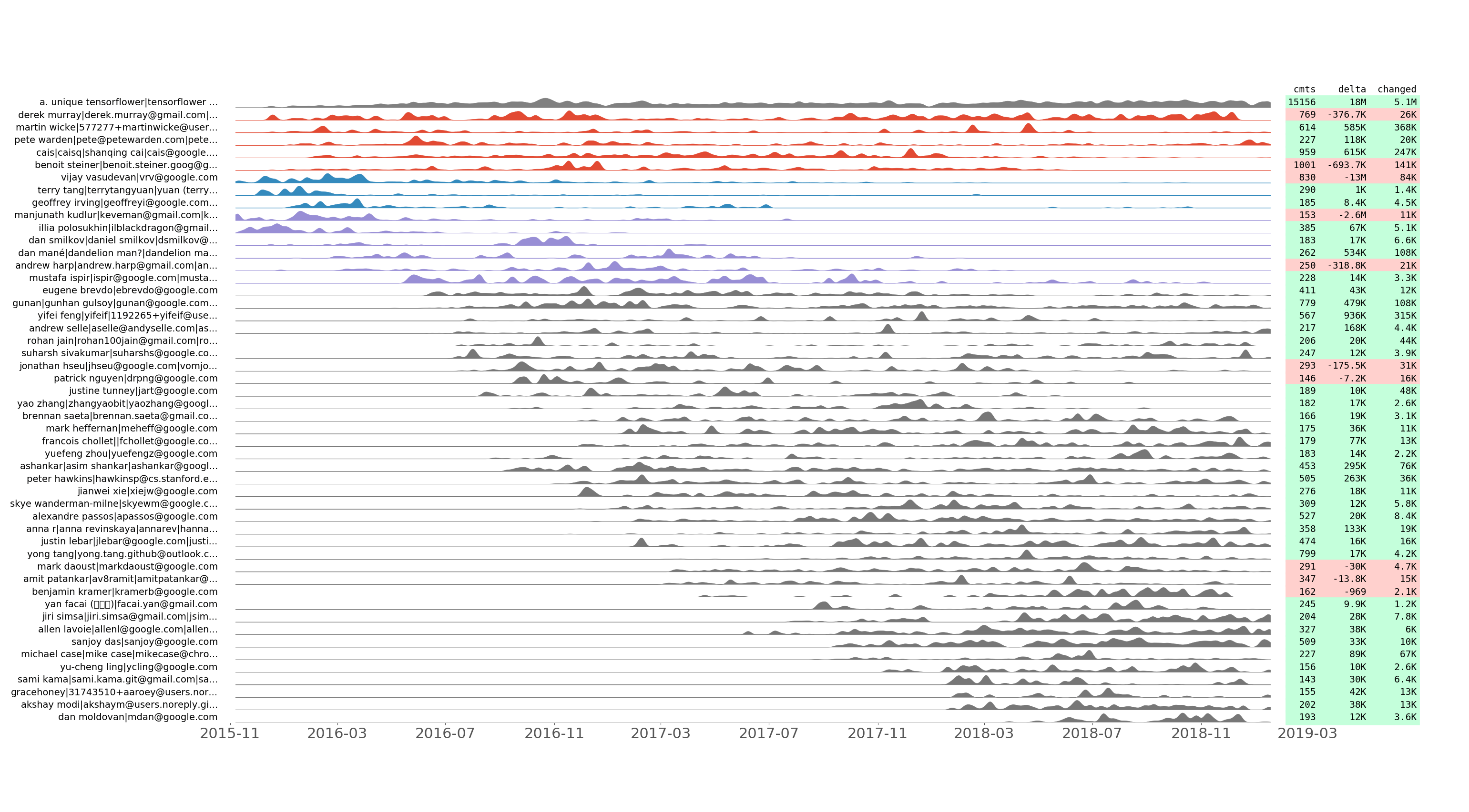 This plot allows to discover how the development team evolved through time. It also shows "commit flashmobs" such as Hacktoberfest. For example, here are the revealed insights from the tensorflow/tensorflow plot above: